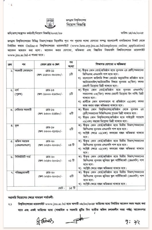 পদসংখ্যা: ২টি; বেতন: ১২,৫০০-৩০,২৩০ টাকা (গ্রেড-১১);