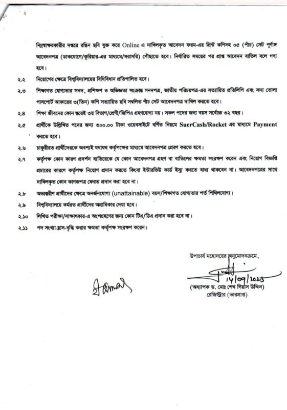 আবেদন ফি—আবেদন ফি বাবদ ৩০০ টাকা সুপারক্যাশ/রকেটের মাধ্যমে জমা দিতে হবে;আবেদনপত্র পাঠাবেন যে ঠিকানায়—রেজিস্ট্রার (ভারপ্রাপ্ত) অধ্যাপক ড. মো. শেখ গিয়াস উদ্দিনের দপ্তরে অফিস চলাকালে সরাসরি-ডাক বা কুরিয়ারযোগে পৌঁছাতে হবে;