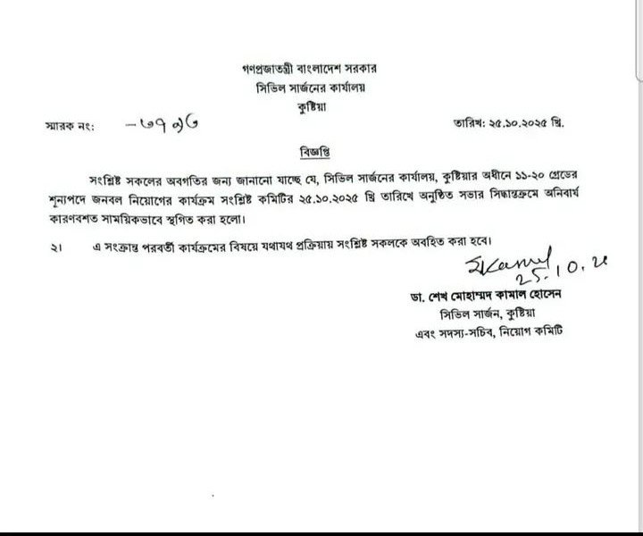 অনিবার্য কারণবশত সাময়িকভাবে স্থগিত করা হয়েছে। শনিবার (২৫ অক্টোবর) নিয়োগ কমিটির