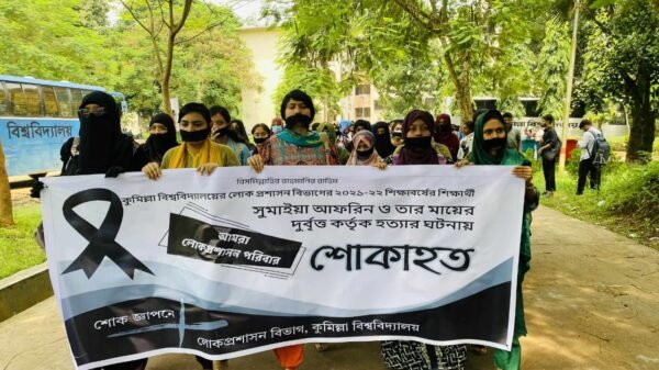 কুমিল্লা বিশ্ববিদ্যালয়ের (কুবি) লোক প্রশাসন বিভাগের ২০২১-২২ শিক্ষাবর্ষের শিক্ষার্থী সুমাইয়া আফরিন রিনথি ও তার মা তাহমিনা আক্তার ফাতেমা হত্যাকাণ্ডে শোক